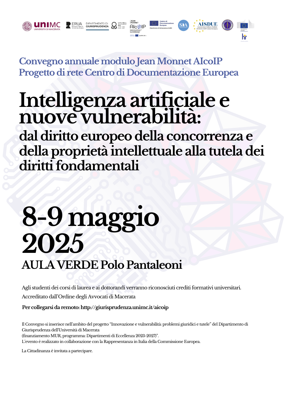 On the occasion of Europe Day, the first conference of the Jean Monnet AIcoIP Module, sponsored by the Department of Law of the University of Macerata, kicks off. An event that focuses the dialogue between academia, practitioners and institutions on crucial issues such as: