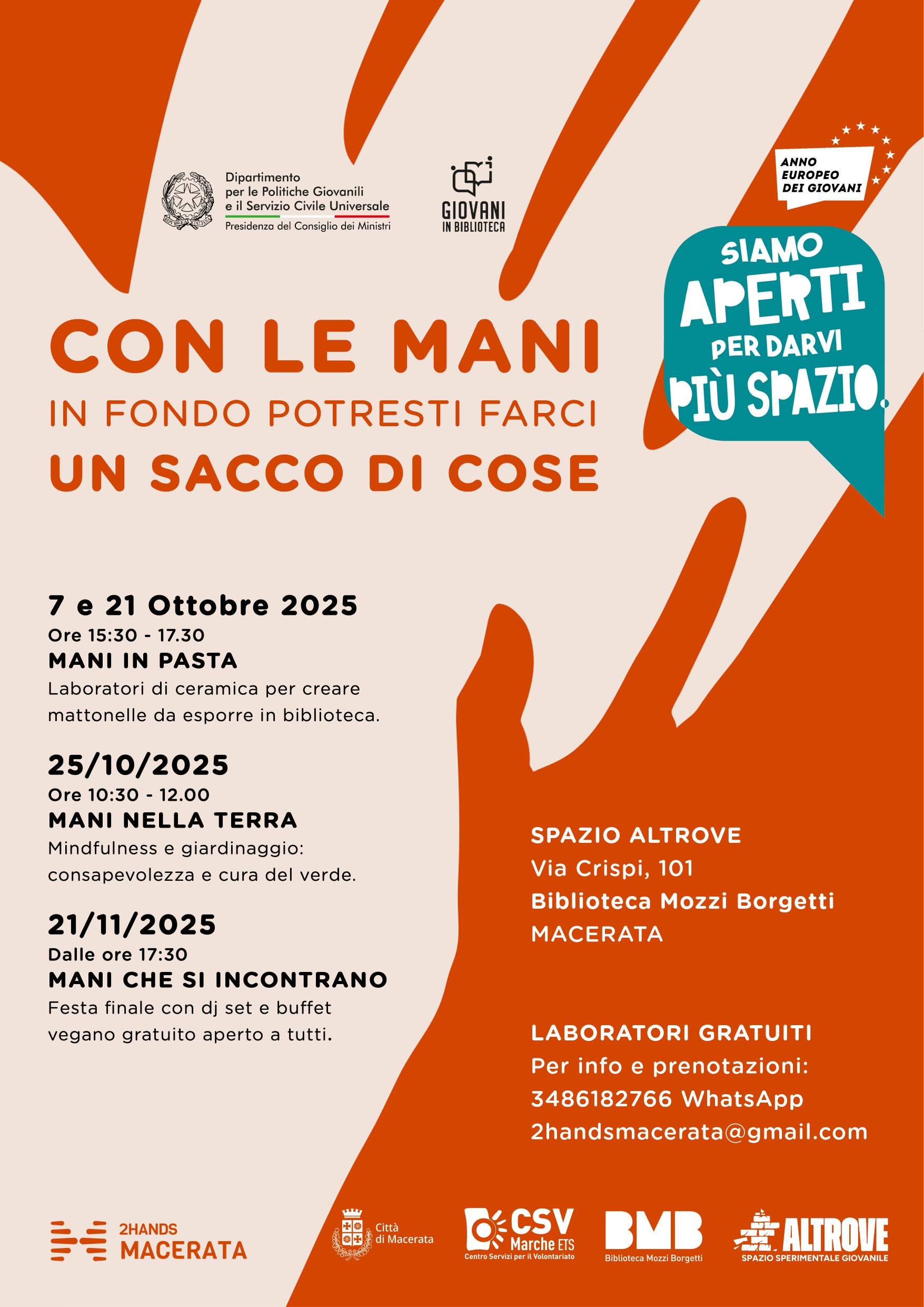 "Con le mani, in fondo potresti farci un sacco di cose" è un percorso esperienziale, a cura di 2Hands Macerata, ispirato alla filosofia dello slow life, che invita a riscoprire il valore del tempo lento, della manualità e della creatività condivisa.