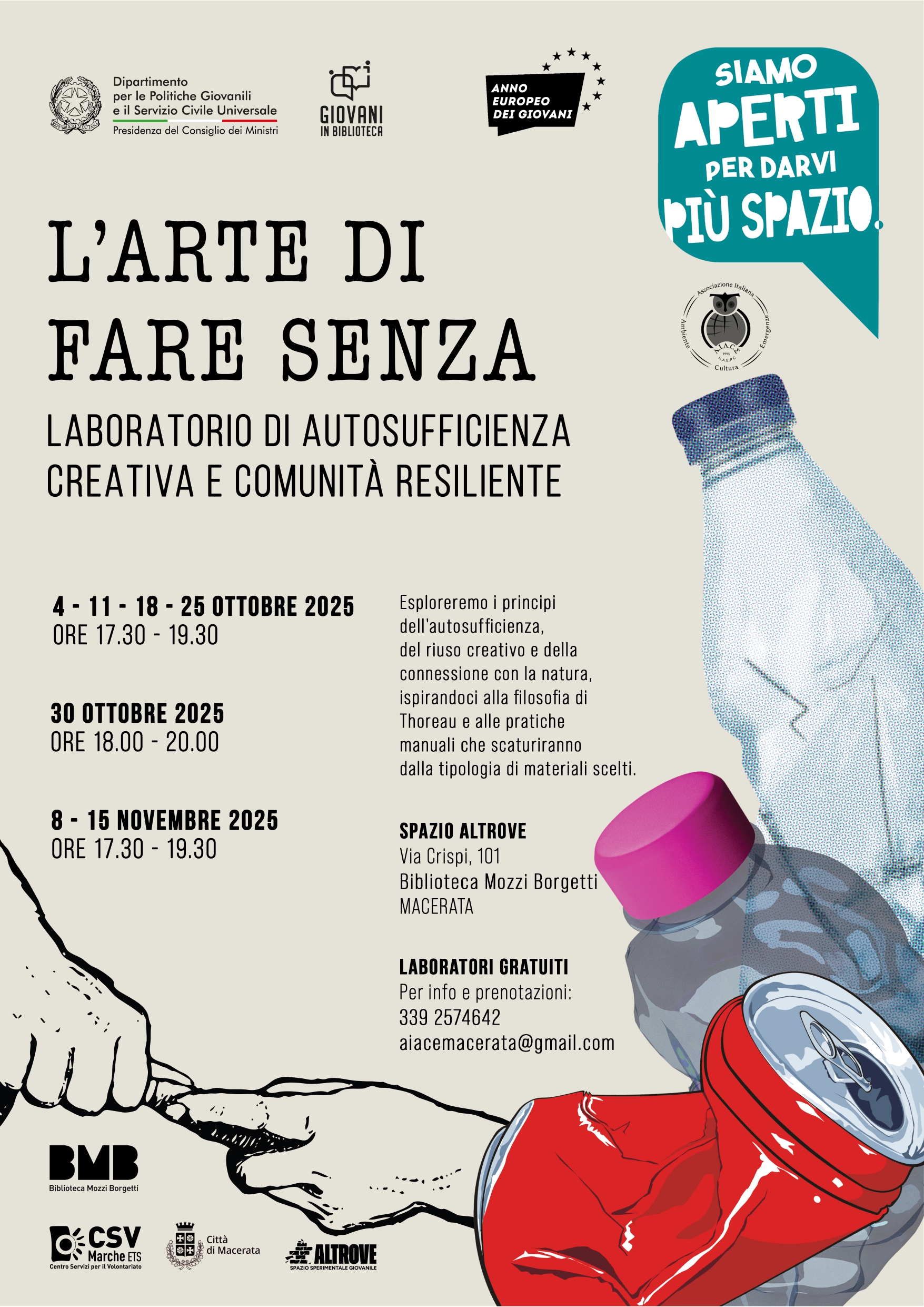 Prende il via “L’arte di fare senza”, un laboratorio a cura di AIACE, dedicato al riuso creativo e all’upcycling. Otto appuntamenti tra ottobre e novembre per esplorare i principi dell’autosufficienza, della connessione con la natura e della creatività spontanea, ispirandosi alla filosofia di Thoreau. Un percorso per imparare a dare nuova vita a ciò che consideriamo rifiuto, coltivando uno sguardo più attento e sostenibile.