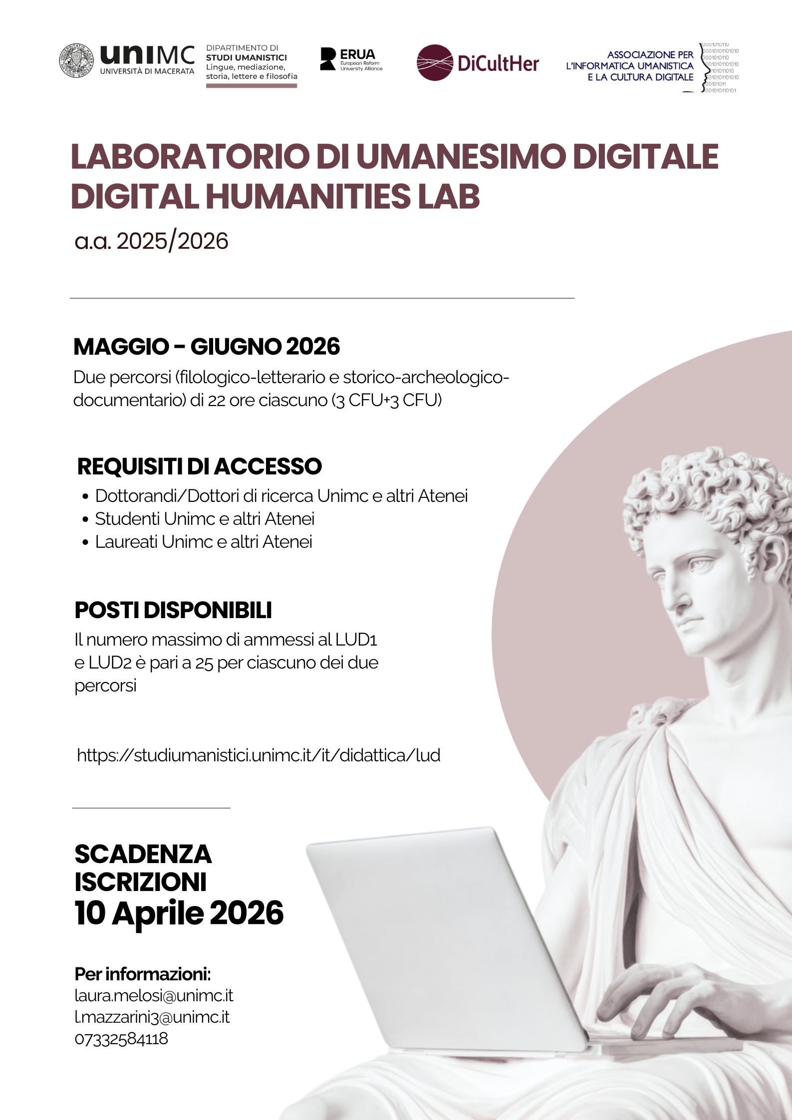 Per tutti i dettagli, per scaricare il bando, compilare la domanda on-line, ecc. consultare la pagina del sito di Dipartimento dedicata al Laboratorio.